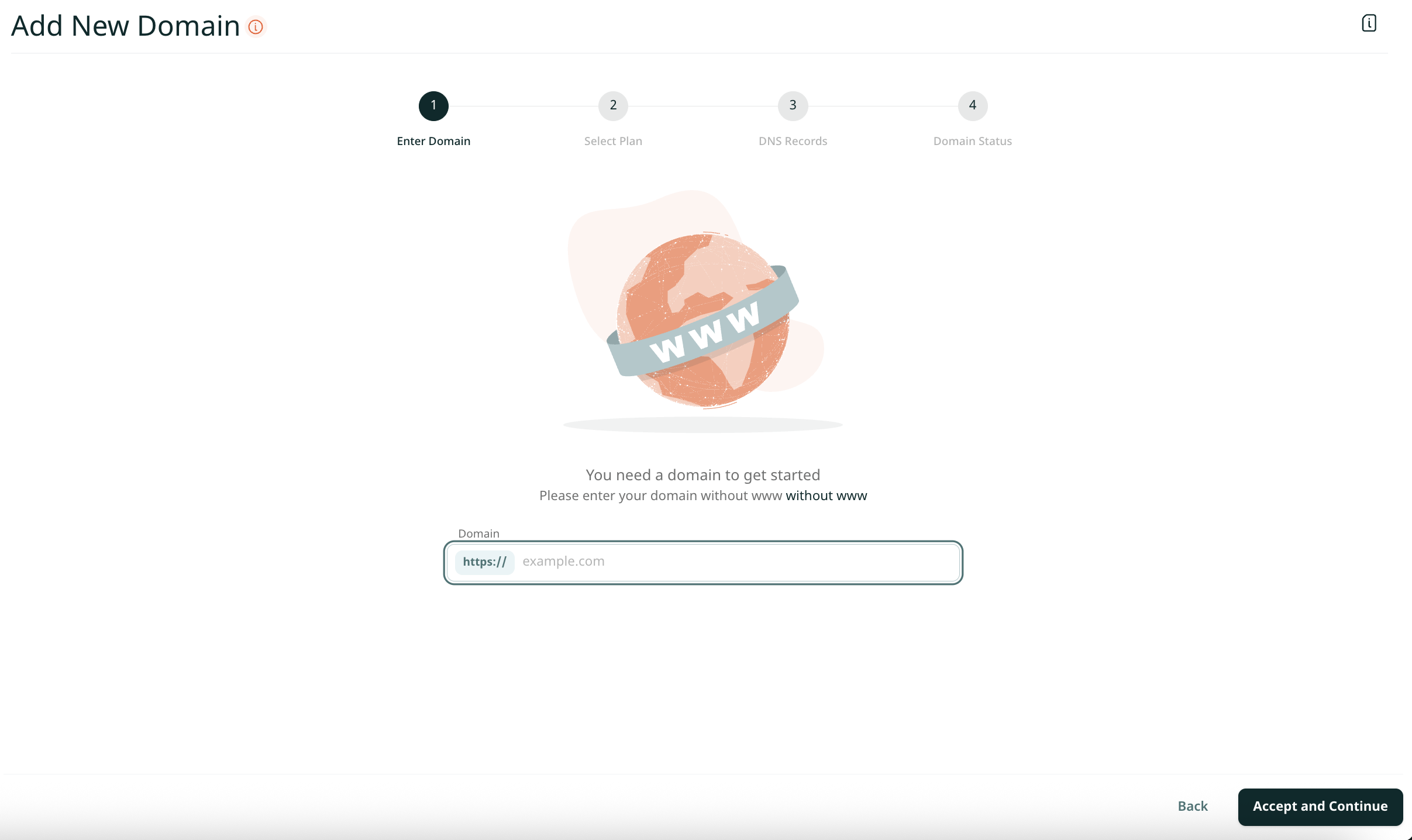 Once your email is verified, you will be prompted to add your first domain. Enter the domain name you wish to manage with VergeCloud. This step is critical because adding a domain is the first step toward setting up your CDN and DNS services. Ensure that the domain you enter is registered under your ownership to prevent any verification issues during configuration.
