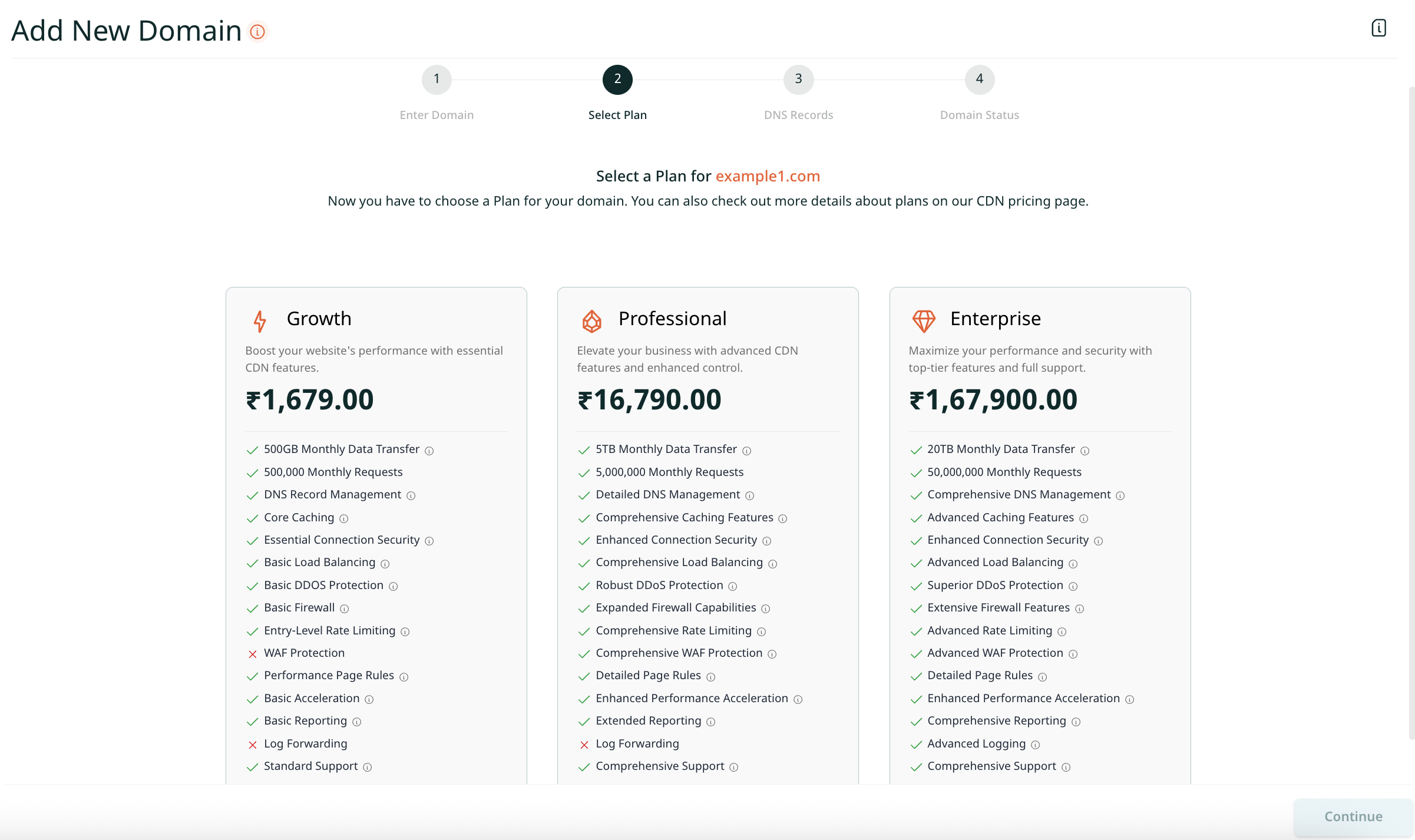 After adding your domain, you will be presented with different VergeCloud plans. Each plan has its own features, bandwidth limits, and services. Take a moment to review the options carefully and select the plan that best matches your current needs. VergeCloud allows plan upgrades at any time, so you can start with a basic plan and scale up as your traffic grows.