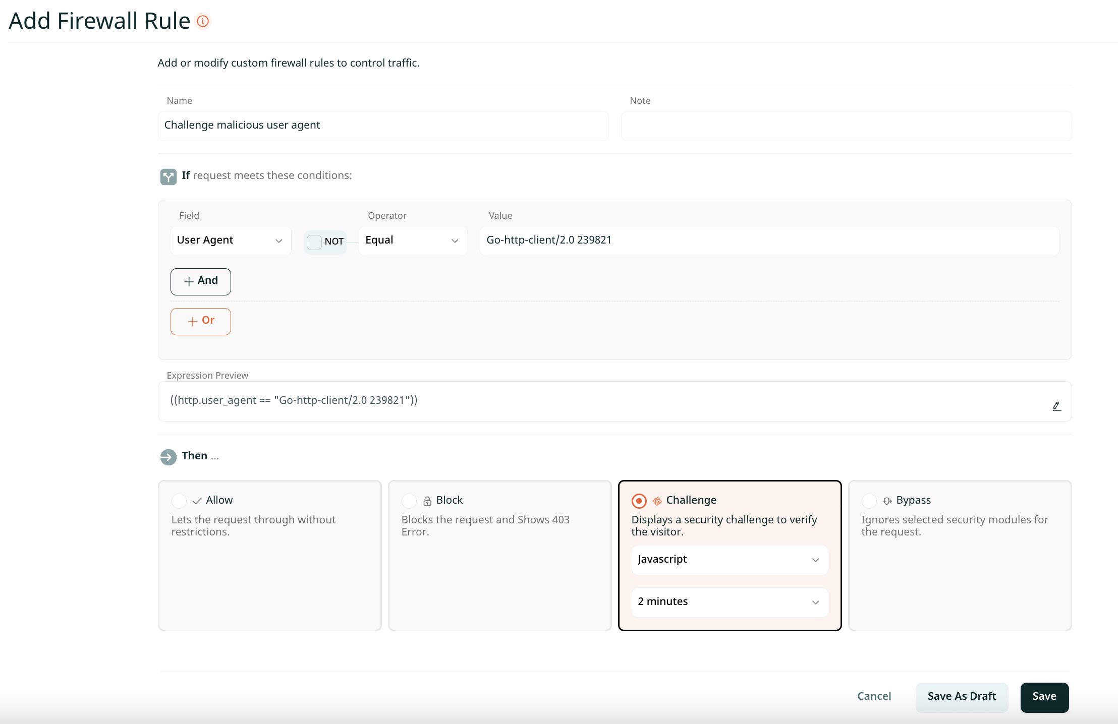 - Providing granular firewall rules to block or challenge abusive IPs, fingerprints, or user agents