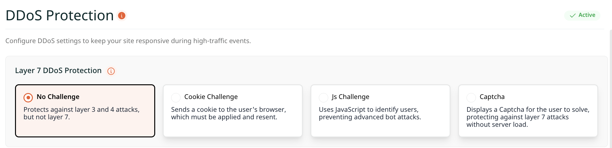 Targets advanced bots and application-layer attacks. VergeCloud offers 3 challenge modes: