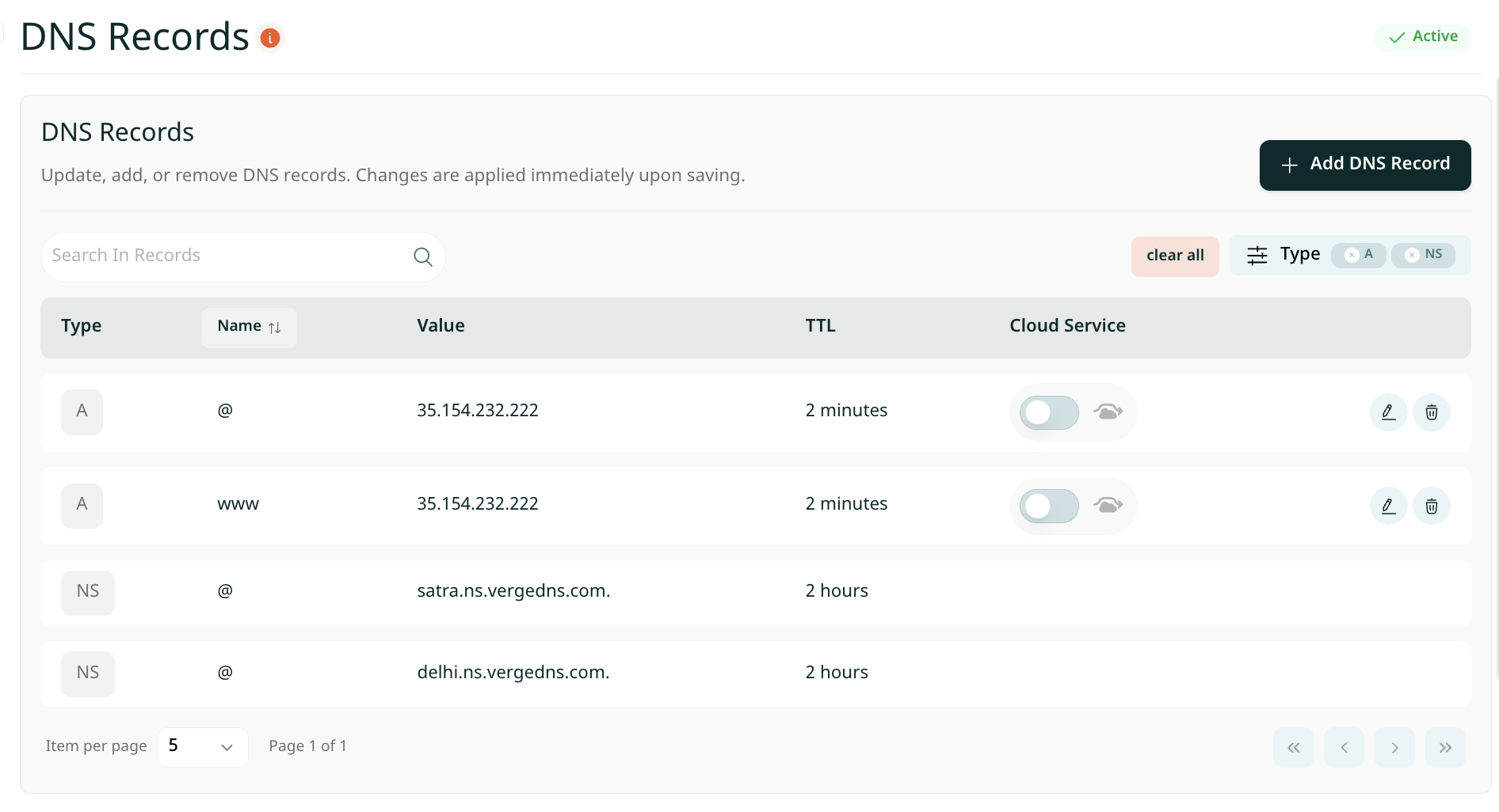 - Cloud Icon: Toggle on to enable VergeCloud’s CDN services. We recommend disabling it temporarily to check record resolution. How to Setup Cloud Icon?