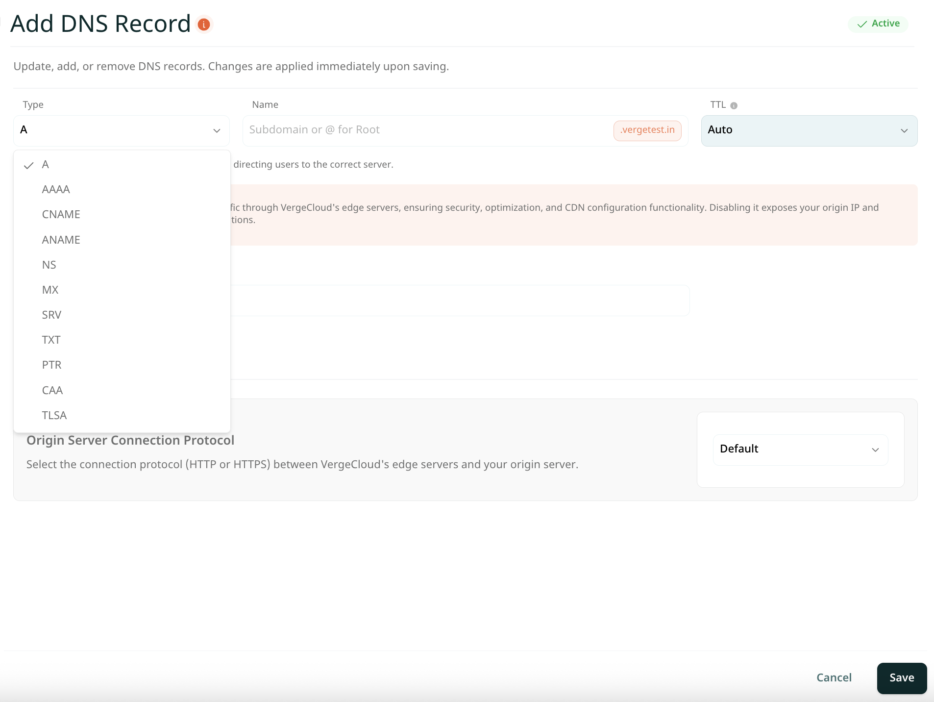 Cloud Icon: Toggle on to enable VergeCloud’s CDN services. We recommend disabling it temporarily to check record resolution. How to Setup Cloud Icon? - Save the record.