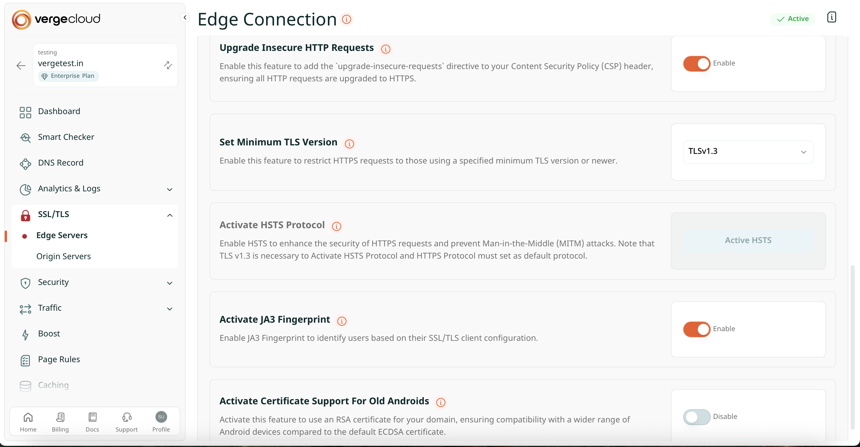 During the TLS handshake, VergeCloud extracts the client’s SSL/TLS configuration, including: