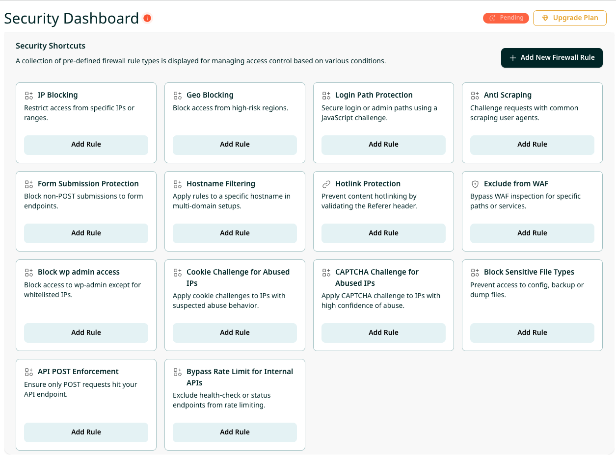 Security Shortcuts provide a fast and effective way to apply common firewall protections. Each shortcut represents a predefined rule template for common use cases, such as blocking abusive IPs or enforcing request methods on APIs. Users can customise each rule before applying it.