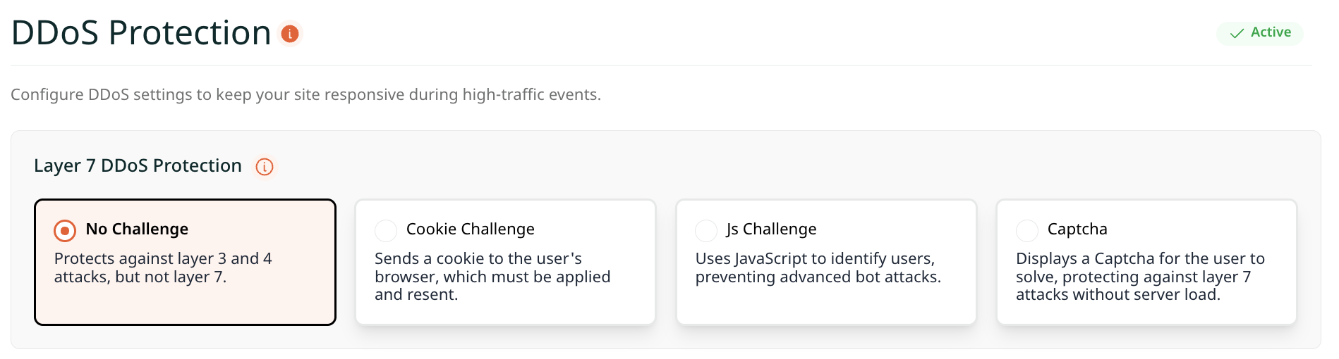 This mode is particularly useful during suspicious traffic spikes where you want stronger verification without resorting to a full CAPTCHA. Most users pass instantly, and the challenge acts as a lightweight but effective filter against non-human requests.