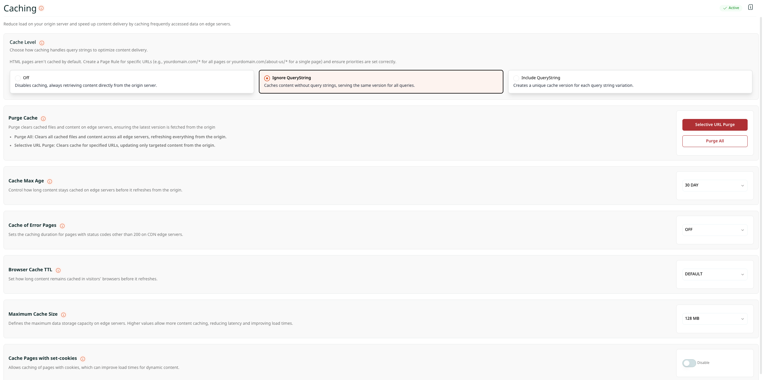 • Purge Everything: Clears all cached content at every edge location. Use this only when absolutely necessary, as it can temporarily increase load on your origin.