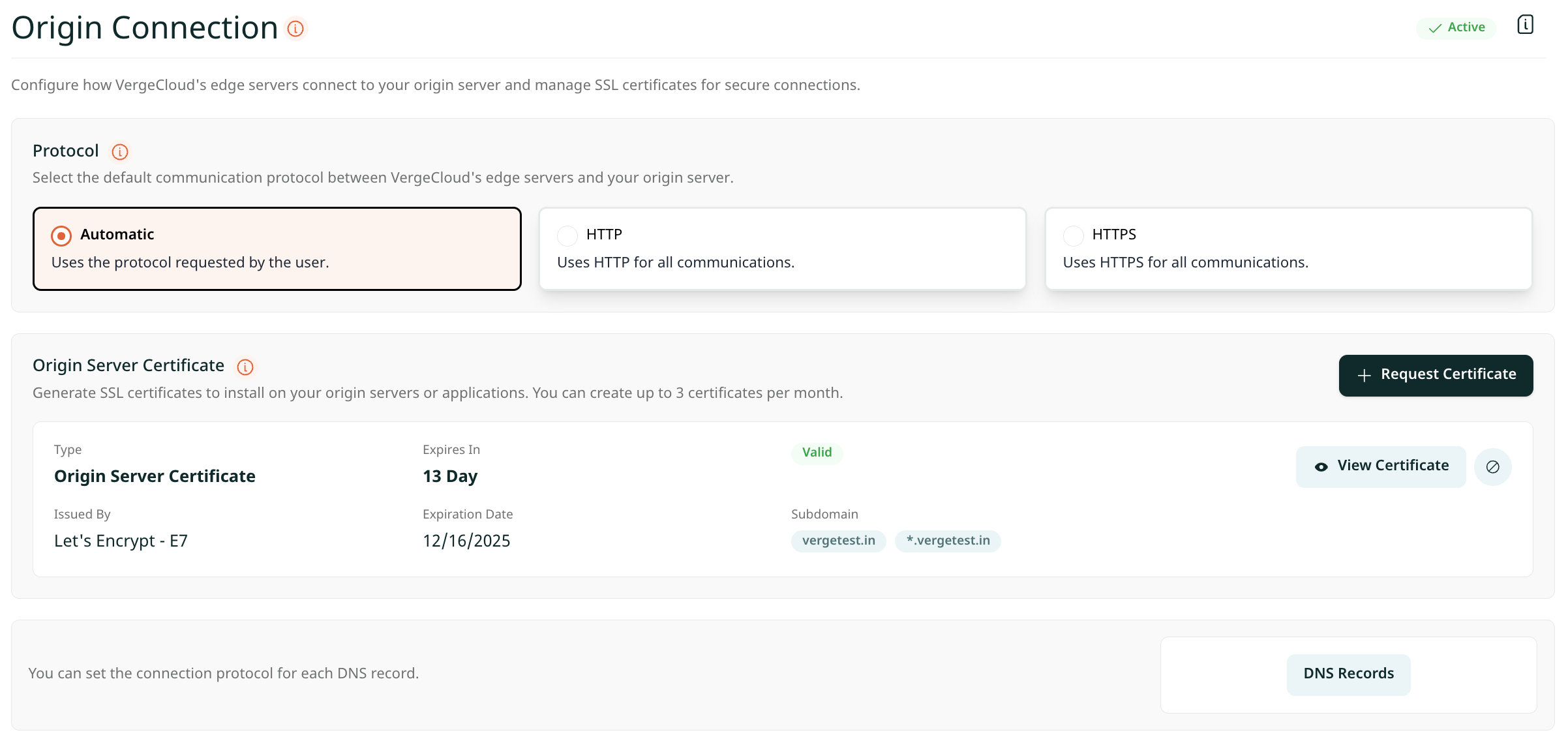 You can specify how VergeCloud’s edge servers connect to your origin server. Options include HTTP, HTTPS, or automatic. If HTTPS or automatic is chosen, your origin must support HTTPS. You can configure this individually for each DNS record. When set to default, the global settings from this section apply.
