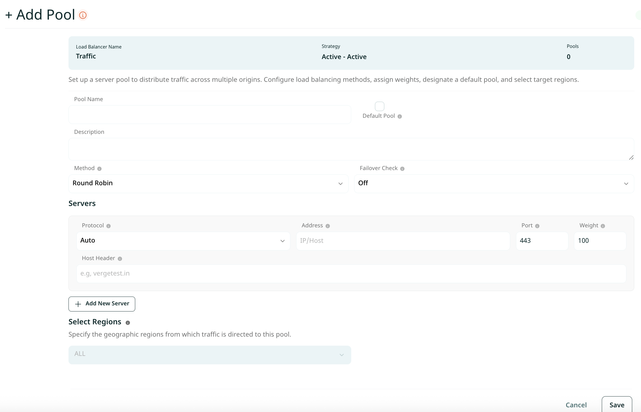 The first step in configuring load balancing begins under the Traffic menu of your VergeCloud dashboard. After navigating to the Load Balancing section and selecting Create, you can configure settings such as the load balancer name, description, and operating mode. VergeCloud supports two main methods. The Active-Active method distributes traffic among all healthy pools according to the assigned geolocations. The Active-Passive method prioritizes the primary pool, directing traffic there unless the pool becomes unhealthy, in which case traffic automatically shifts to the next available pool.