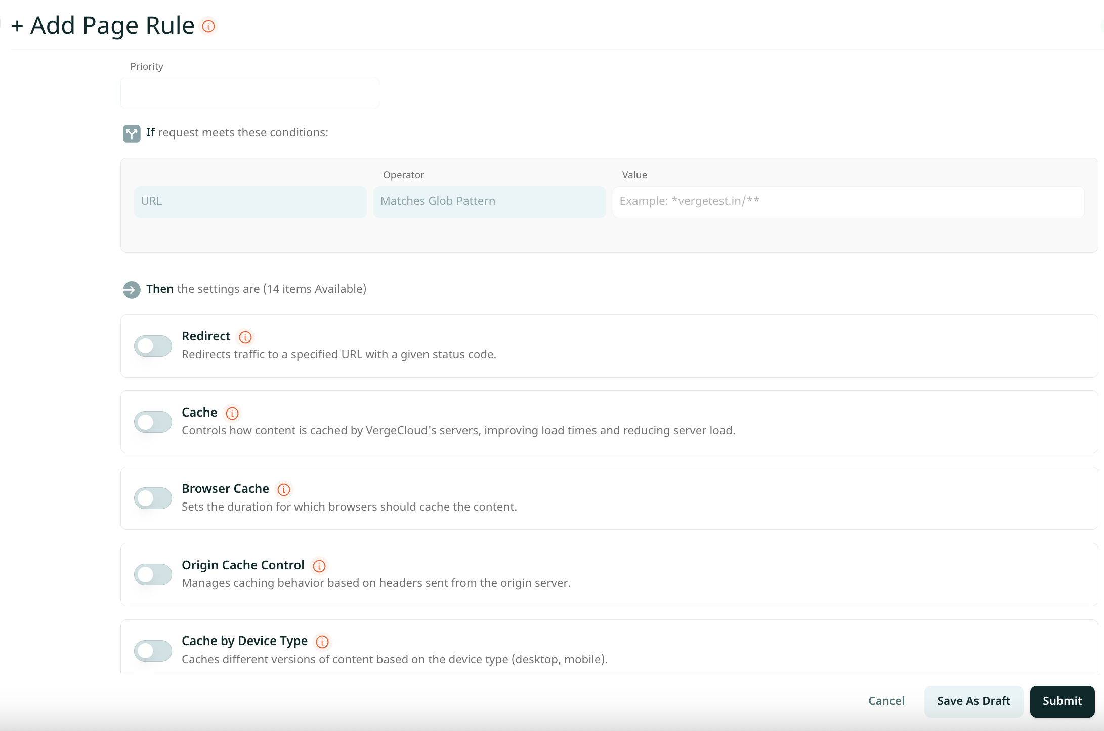 Because Page Rules execute at VergeCloud’s global edge network, changes take effect instantly and do not require modifications to your backend or codebase. This ensures faster deployments, reduced origin load, and consistent behavior across all regions